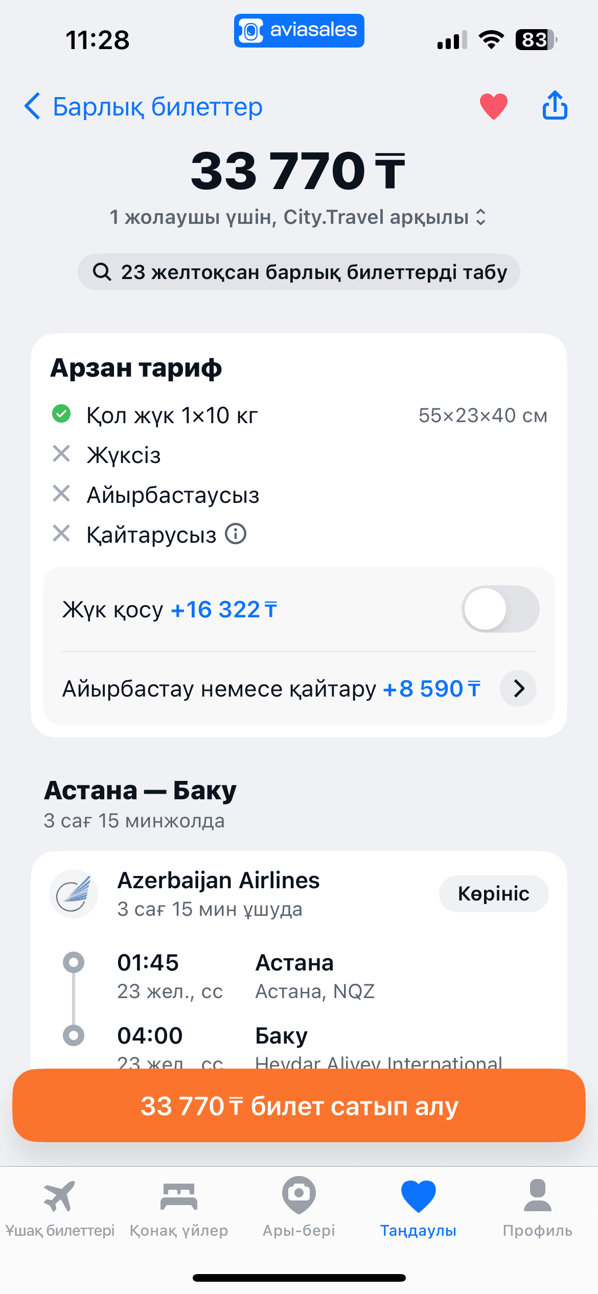 Перелёт из Астаны в Баку и обратно обошёлся мне в 70 000 тенге. Поймать такую цену помогла классная фишка в приложении Aviasales.kz: я просто добавила нужный рейс в «Избранное», и когда у авиакомпании AZAL появилась скидка, мне тут же пришло уведомление. Подробнее о том, как это работает, ребята писали в своём телеграм-канале.