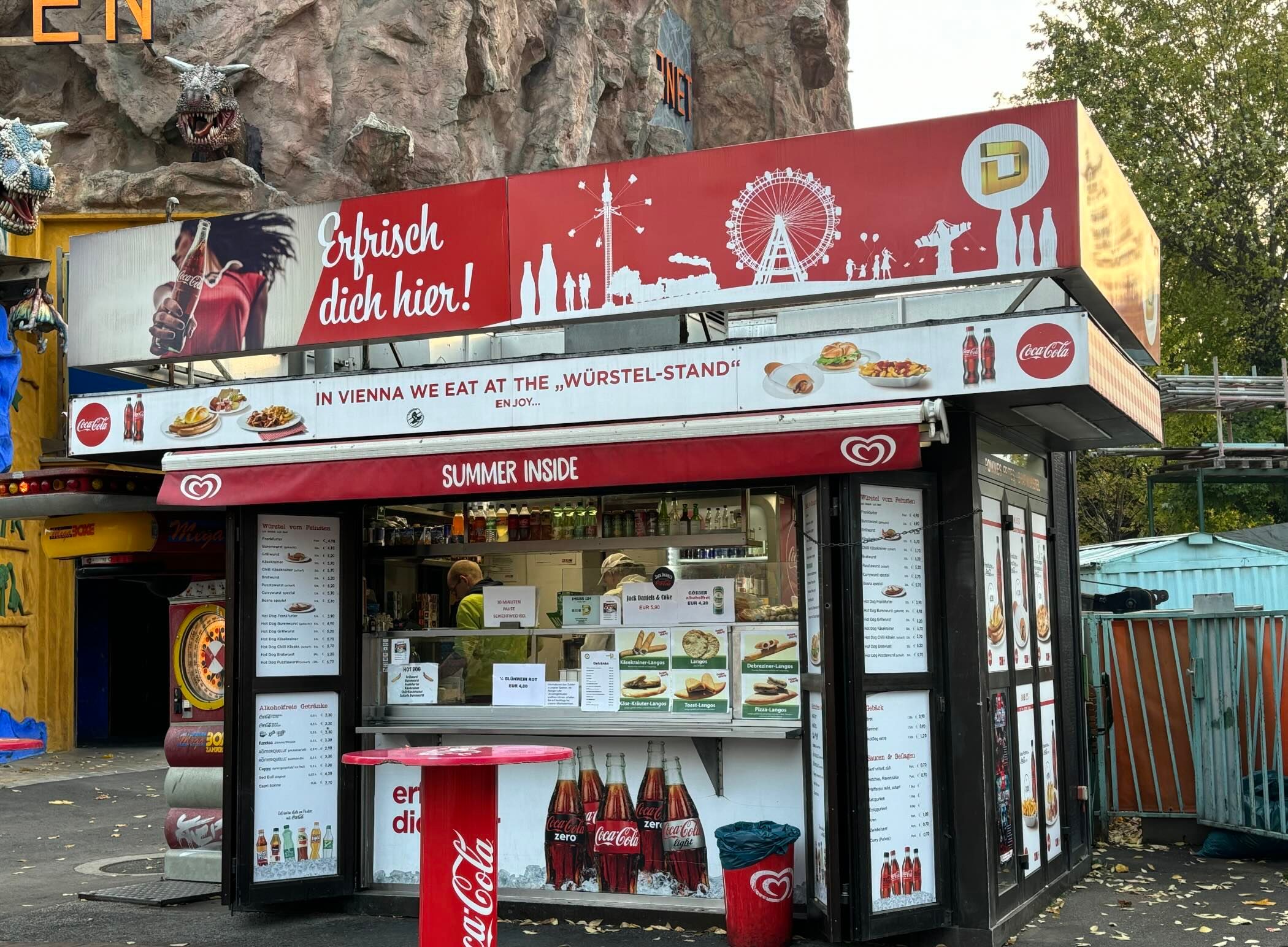 С едой проблем нет: по всей территории много кафе, закусочных и традиционных киосков — вурстльштанд (Würstelstand), где подают жареные сосиски с картофелем фри. В Австрии картофель фри называют «поммес» (от французского pommes frites). Сосиски обычно из свинины — «швайнефляйш» (Schweinefleisch), но встречаются и из индейки («путэнфляйш») или говядины («риндфляйш»). Лучше уточнить у продавцов.