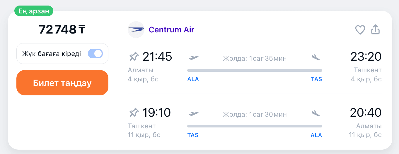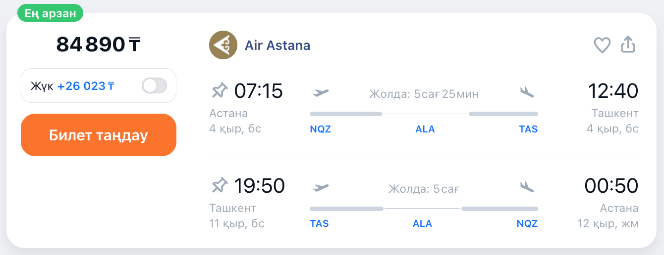 Барып-қайтуға ұшақ билеттері | 73 мыңнан бастап |