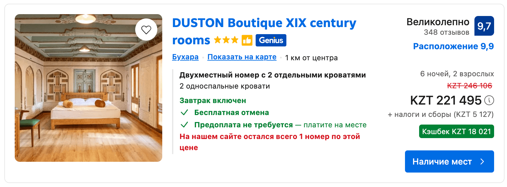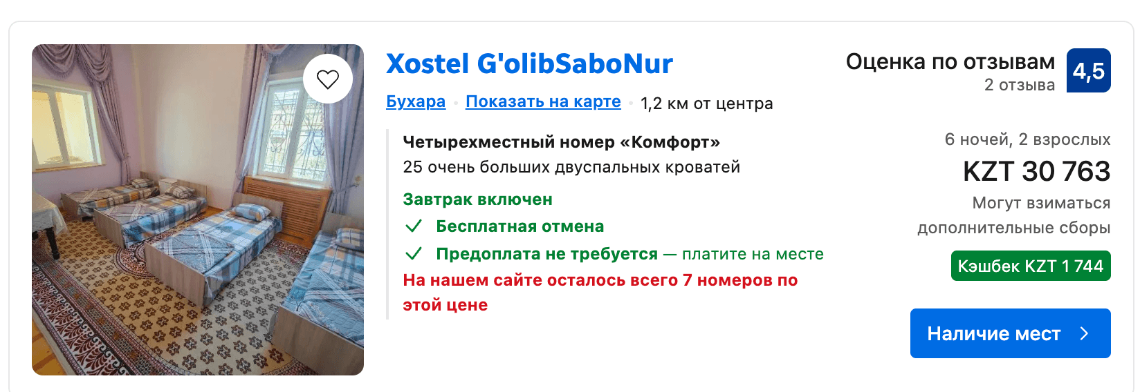 Бұхарада кез келген бюджетке сай баспана табу оңай. Егер қаланың шынайы атмосферасын сезінгіңіз келсе, ескі қаланың аумағындағы бутик-қонақүйлер мен гестхаустарды таңдаңыз. Екі адам бір аптаға шамамен 25 мың теңге төлейді (таңғы асы да бар). Ал барынша жайлы жағдай мен тіпті бассейн болғанын қаласаңыз, Booking.com сайтынан 250 мың теңге тұратын нұсқалар да табылады.
