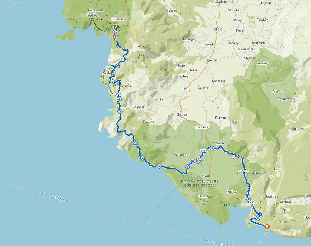 Трек құрастыру үшін Komoot веб-нұсқасын қолдандық. Функционалы жақсы — жолды күндерге бөліп, түнейтін орындар мен қызық нүктелерді белгілейсің. Қолданба офлайн режимде жұмыс істейді, бірақ Түркия аймақтарының карталарын алдын ала жүктеп алу керек. Бір аймақ шамамен 4 доллар тұрады. Біз екеуін жүктедік, себебі Ликия соқпағы бірнеше облыстың түйіскен жерінен өтеді.