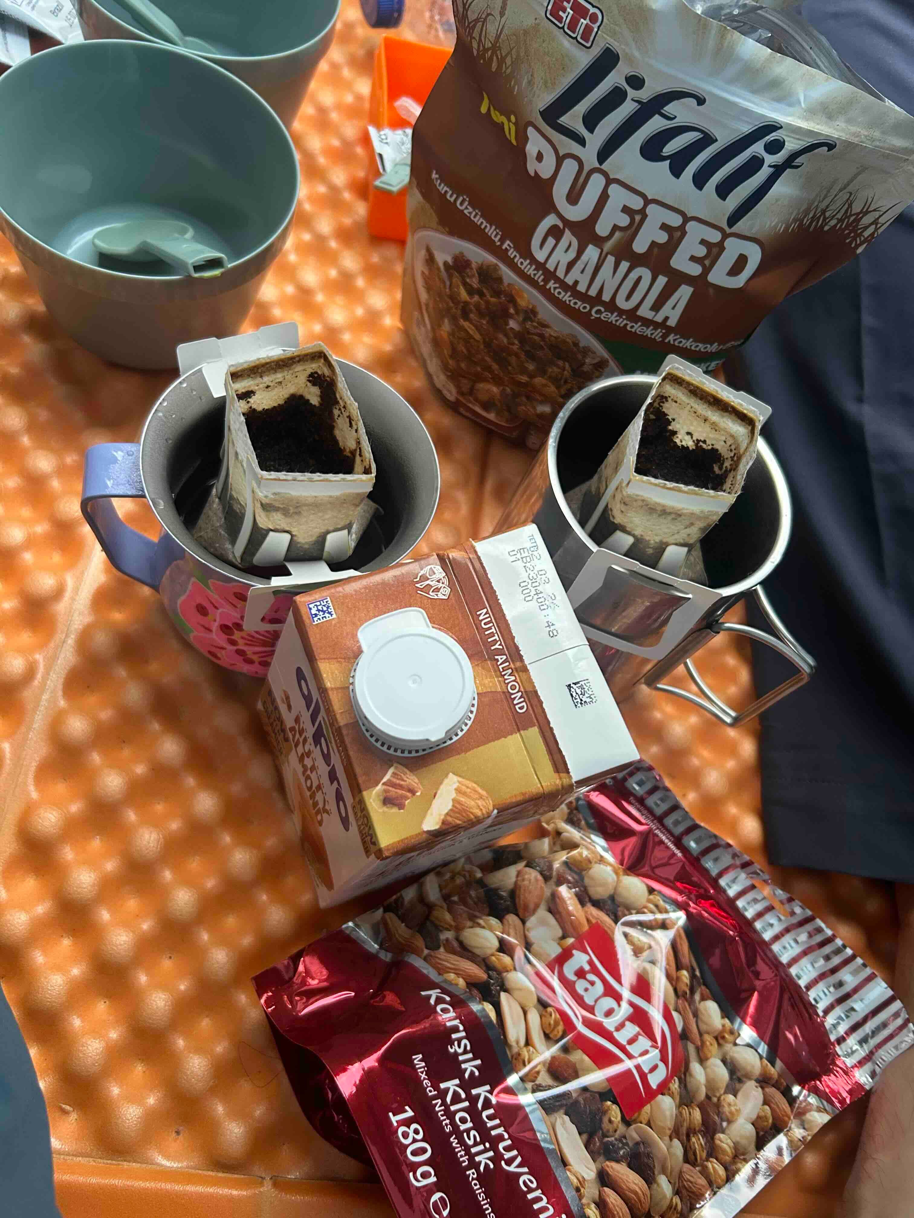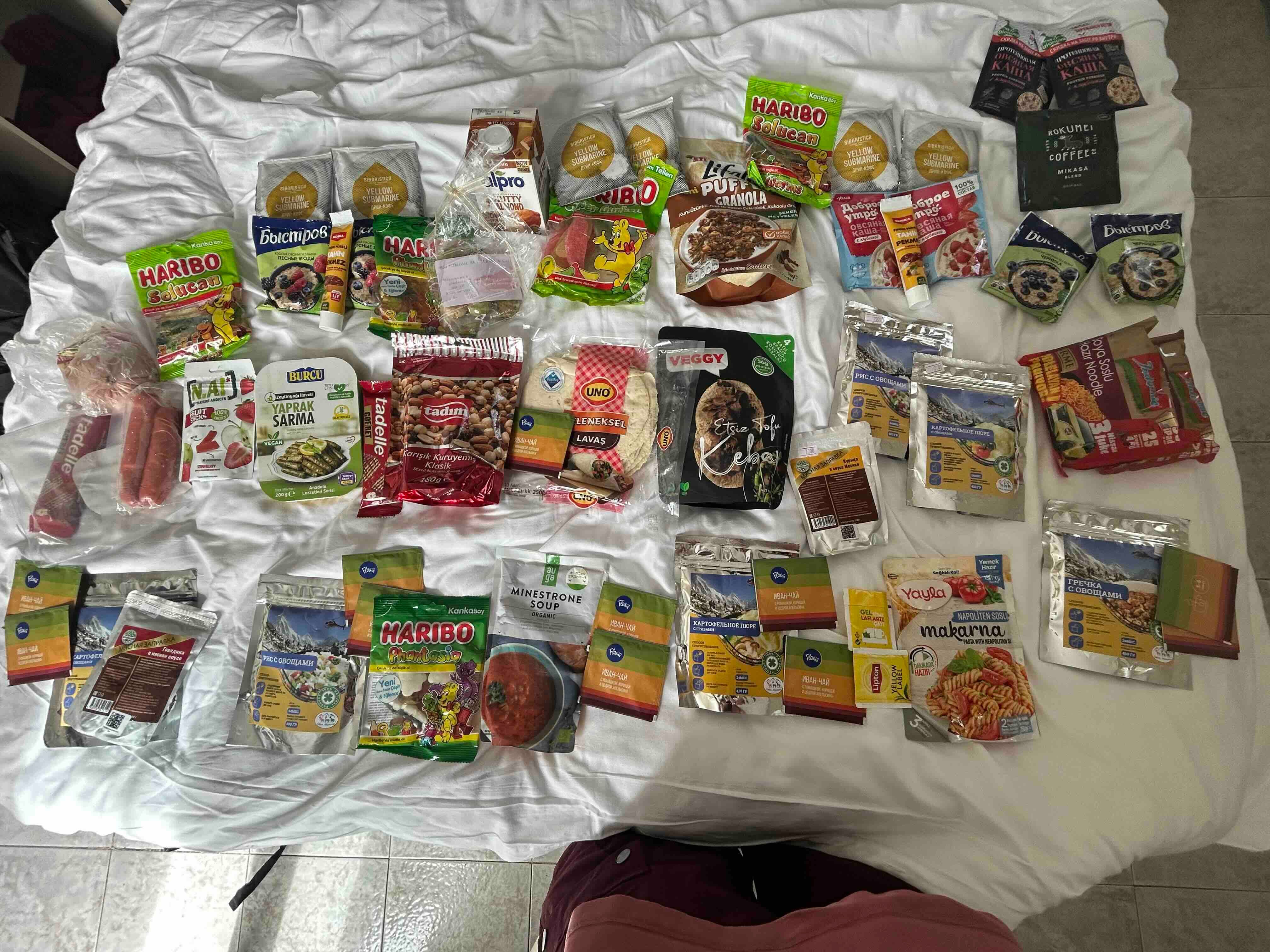 Мәзірді алты күнге алдын ала жоспарладық — таңғы ас, түскі ас, кешкі ас. Қазақстаннан ботқалар, дрип-кофе, тіскебасарлар, шай алып келдік. Фетхие қаласынан гранола, бадам сүті, жаңғақтар, консервіленген долма (веган-френдли!), тофу-кебаб, макарон, лаваш және орман жаңғағынан жасалған пастаны көптеп сатып алдық.