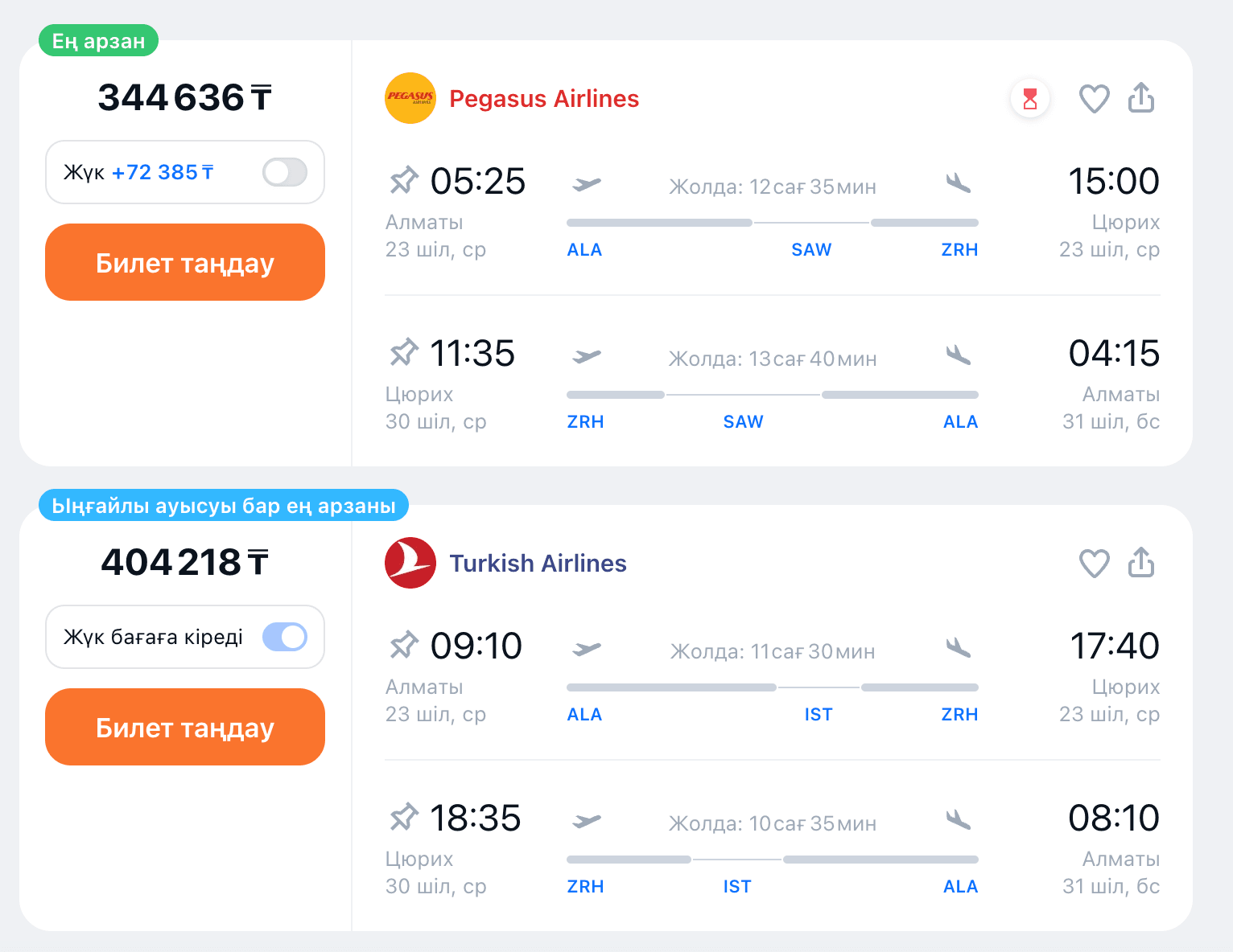 Мәселен, Алматыдан Ыстанбұл арқылы Цюрих қаласына барсаңыз, ұшақ билеті шамамен 357 000 теңге болады. Turkish Airlines әуе компаниясының рейсіне багаж және тамақ кіреді. Ал Pegasus әуе компаниясының билеті 345 мың теңгеден басталады, бірақ бұл сомаға багаж кірмейді. Жалпы Швейцарияға билет құны 350–410 мың теңге аралығында болатынын ескеріңіз. Билеттерді Aviasales.kz сайтынан таба аласыз.